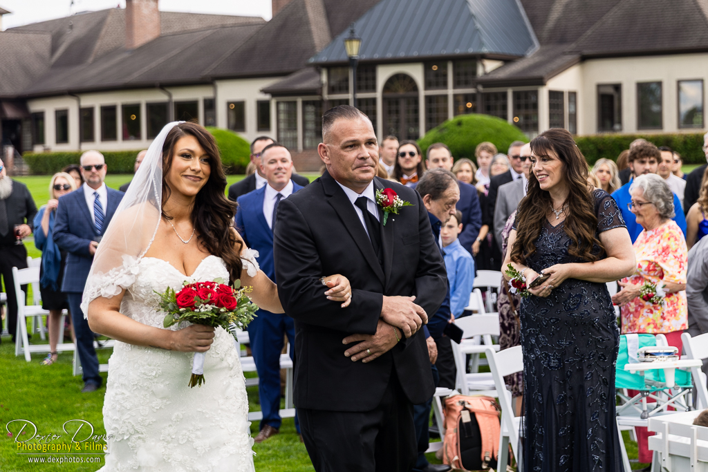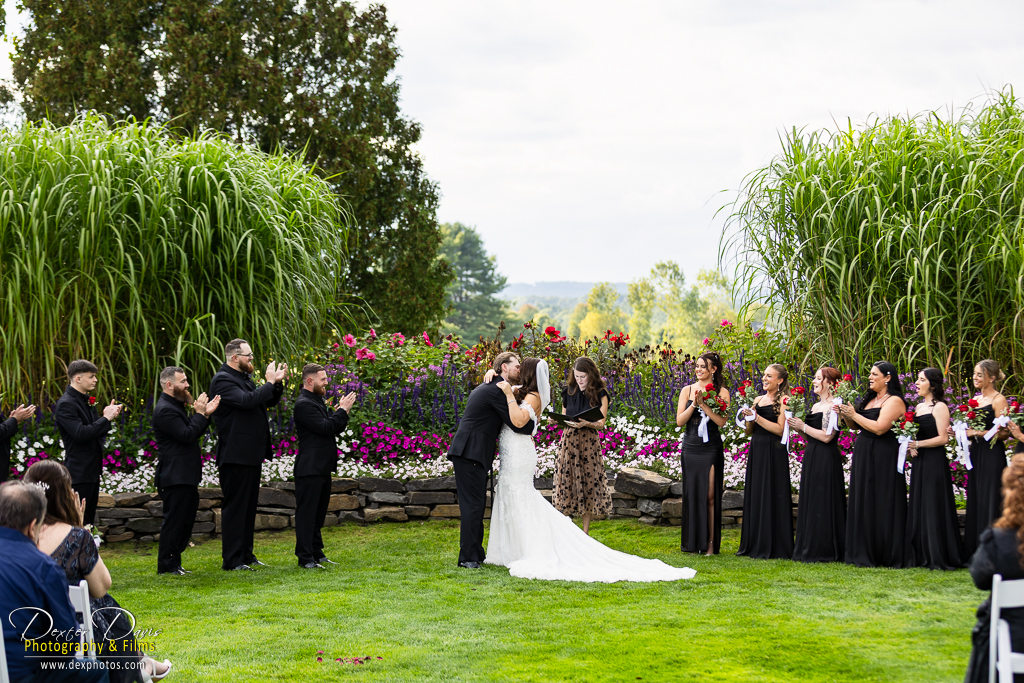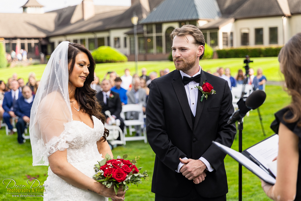 The ceremony took place outdoors, framed by the rolling greens of the country club and the warmth of late afternoon sunlight. As Alicia and Shelley exchanged vows, the love and emotion between them was undeniable. The bridal party stood elegantly nearby, their black dresses and suits punctuated by vibrant red roses, creating a dramatic and beautiful contrast against the bright background of natural flowers and greenery.
