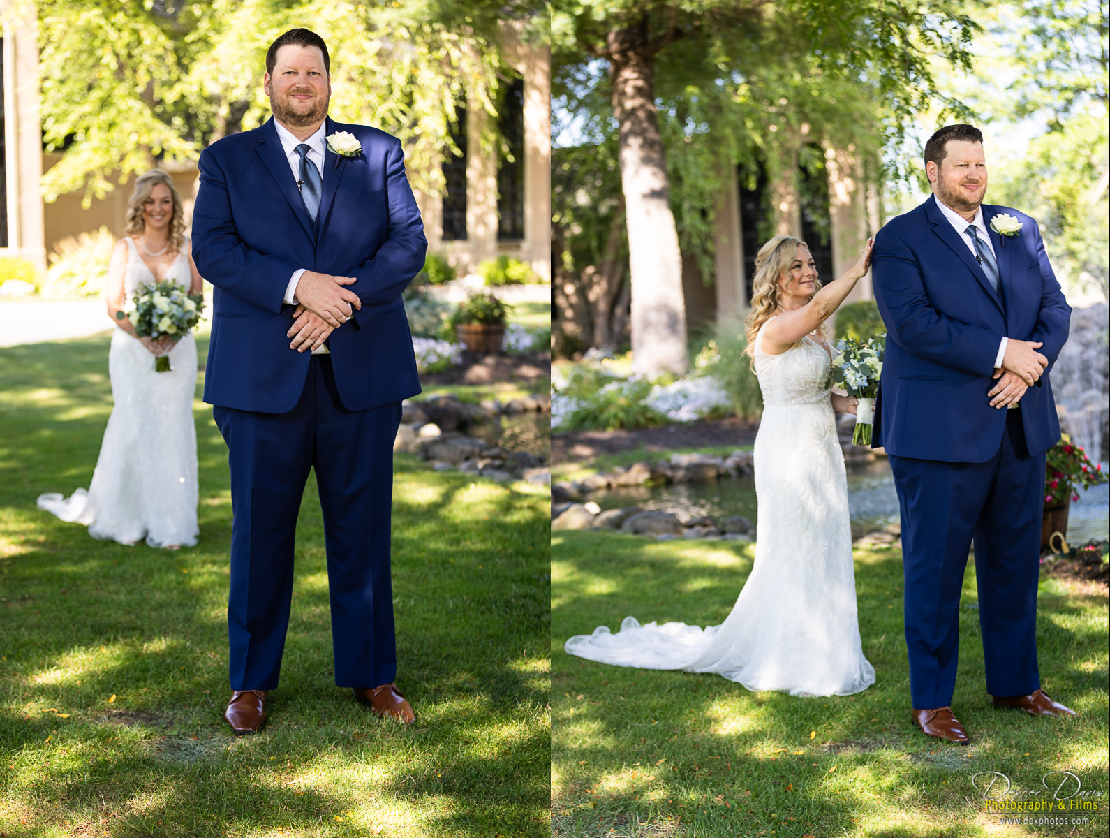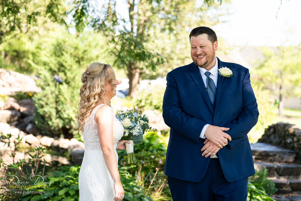 Nestled in a secluded garden on the club grounds, Lindsey and Josh opted for a first look. The moment Josh turned to see Lindsey, his expression said it all—pure awe and love. The late summer sun cast a golden glow, making Lindsey’s gown and the delicate blue accents in her bouquet pop against the lush greenery. These photos are always some of our favorites: raw, unscripted, and full of emotion.