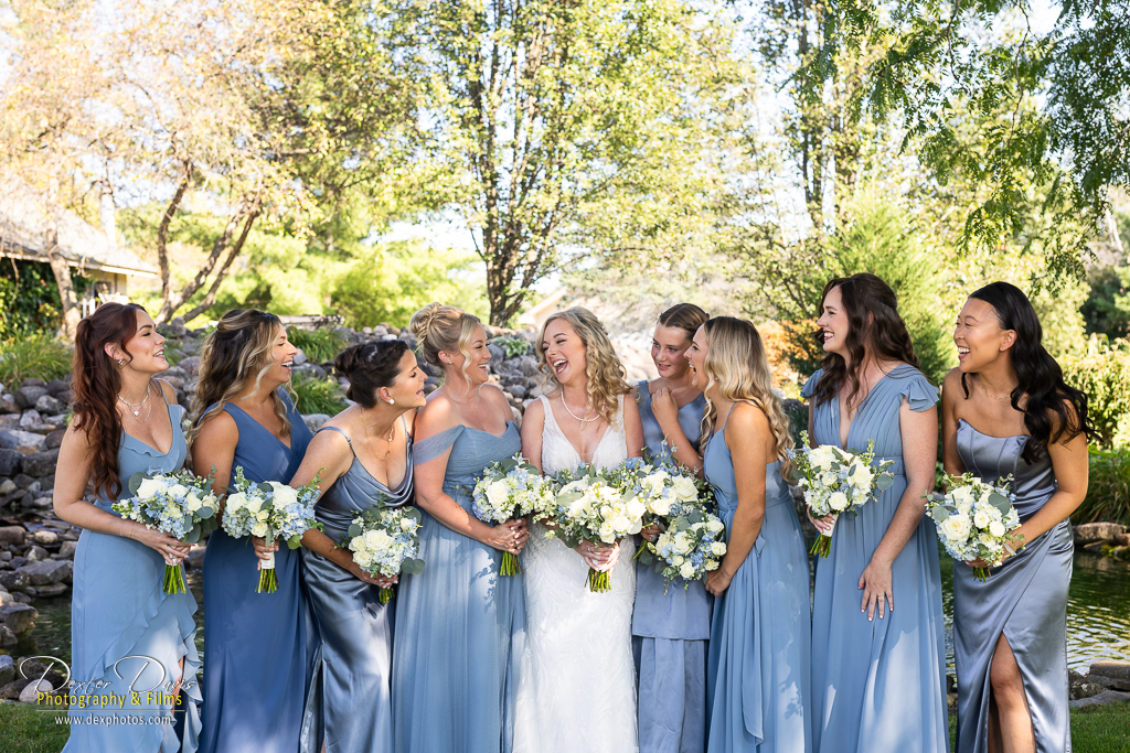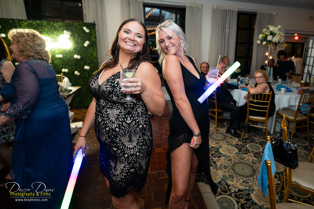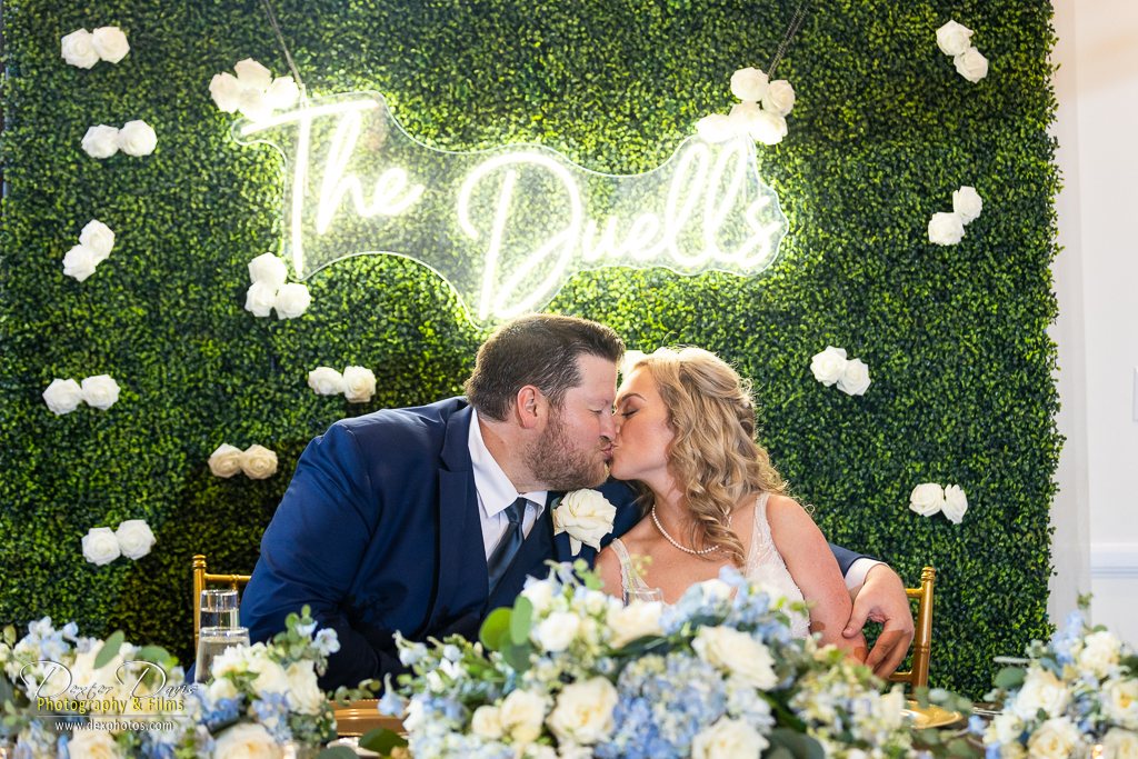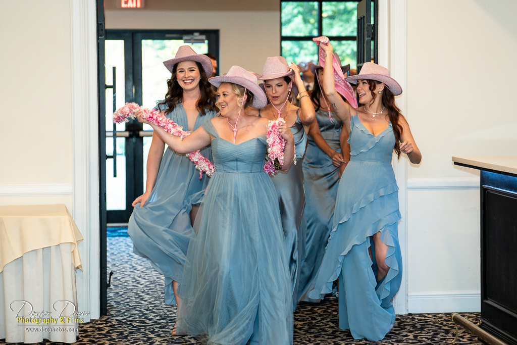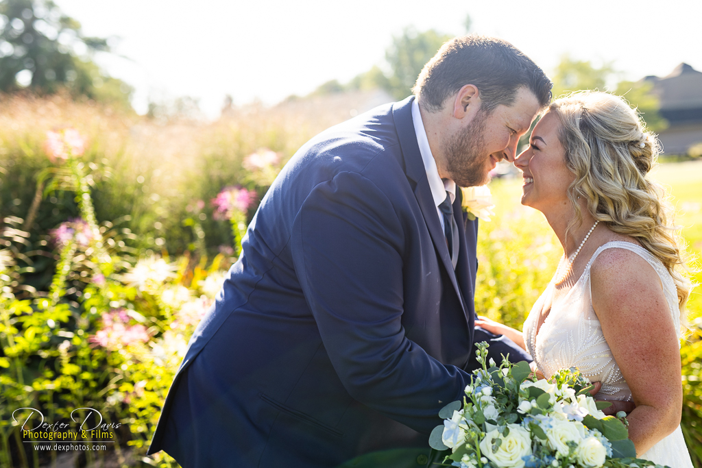 After the ceremony, we wandered the club’s grounds for portraits. The late afternoon light was perfect, illuminating the couple against a backdrop of brilliant green lawns and blooming flowerbeds. Lindsey’s dress danced in the wind, echoing the delicate blue hues of the bridesmaids’ dresses and the intricate floral arrangements. Every frame celebrated the season’s natural beauty and the couple’s effortless connection.