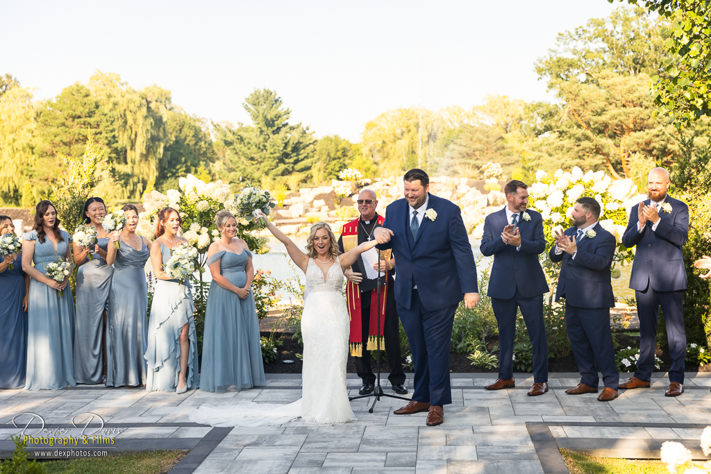 The outdoor ceremony took place on the manicured lawn, framed by mature trees and a gentle river breeze. Pale blue ribbons fluttered from the chairs, and the floral frame—abundant with white and soft blue blooms—set a romantic tone. Lindsey and Josh exchanged vows with happy tears, surrounded by their closest friends and family.